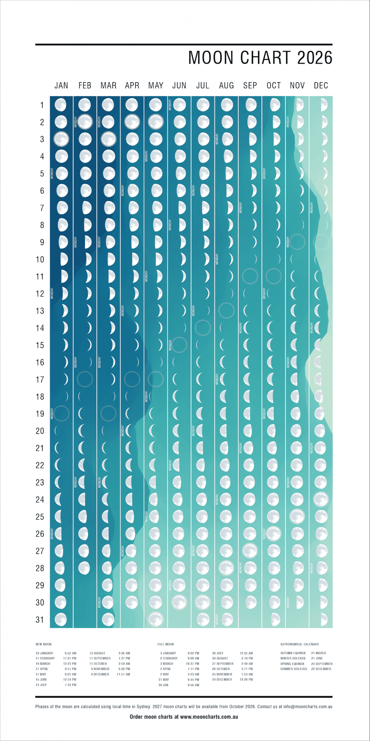 A stark lunar surface background with craters and shadows highlights the phases of the moon.