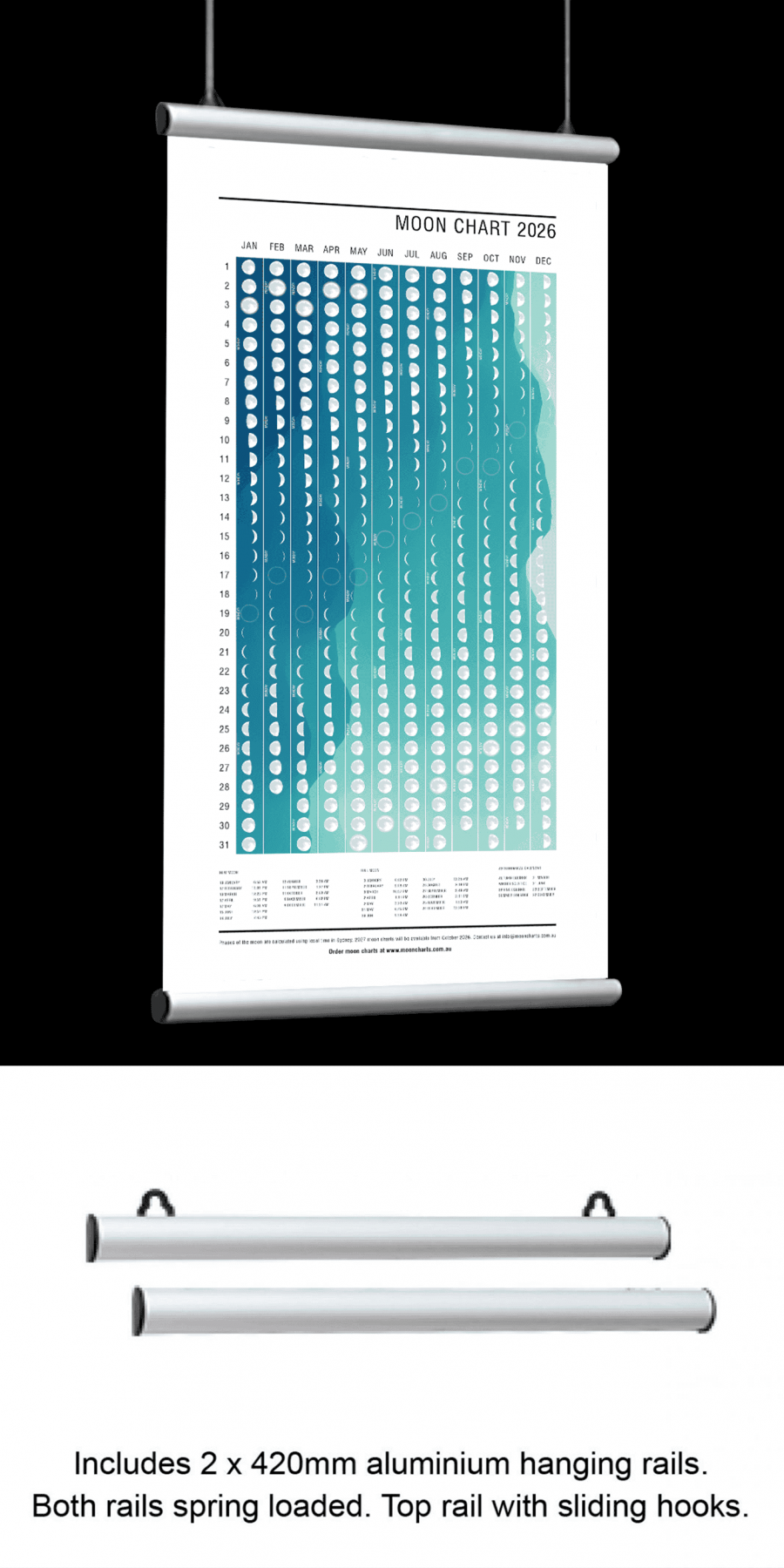 Hang your moon chart easily with this clever poster hanger. The two aluminium rails are spring loaded. Two sliding hooks on the top rail for mounting. No wall fixtures or cord included.